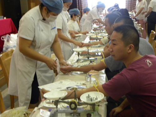 活动现场人头攒动、热闹非凡,酷热的天气丝毫不影响献血人员的热情。献血志愿者排着长队,依次进行填表、登记、体检、验血、采血等步骤,秩序井然。短短半天时间共计献血89300毫升,献血人数和献血量均超越了往年。