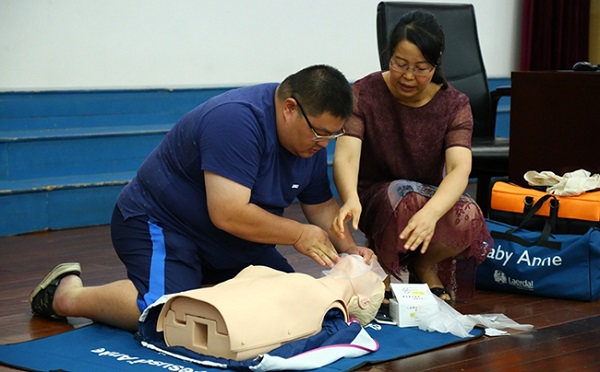 在讲座中,救护培训师第五秀芳从理论和实际操作两个层面和世茂实小的老师明确了紧急救护的相关注意事项。特别是“心肺复苏”这一内容引起了参训教师的极大兴趣。培训师用“叫、叫、鸭、开、口”五个字概括了“心肺复苏”的整个流程。接着,三位参训老师主动上前,在安妮模型上体验CPR实践操作。世茂实小校医陆老师几年前接触过心肺复苏练习,此次培训更加深了体会:“心肺复苏操作看似简单,做好它还是有一定难度的,仍需要我们不断练习,加以熟悉,学会了很有用”。培训师针对三位老师现场操作中的细节问题进行了点评,老师们对“心肺复苏”这一紧急救护技能有了更直观、更全面的认识。