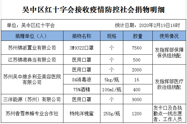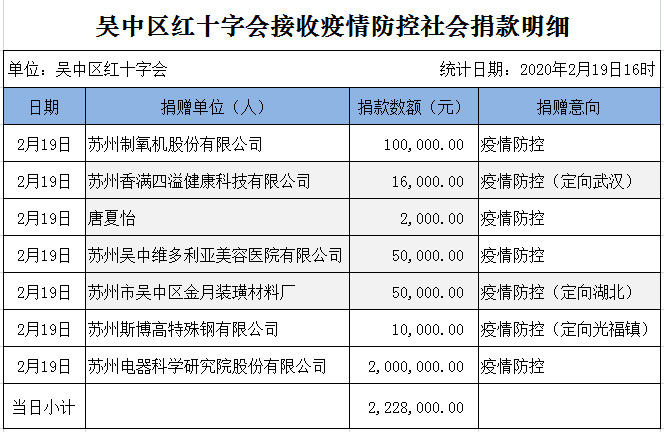 2月19日,吴中区红十字会收到疫情防控捐款2228000元,接收捐赠物资5批次,已完成发放使用。