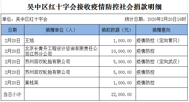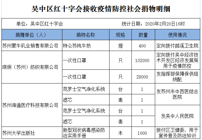 2月20日,吴中区红十字会收到疫情防控捐款22000元,接收捐赠物资4批次,已完成发放使用。