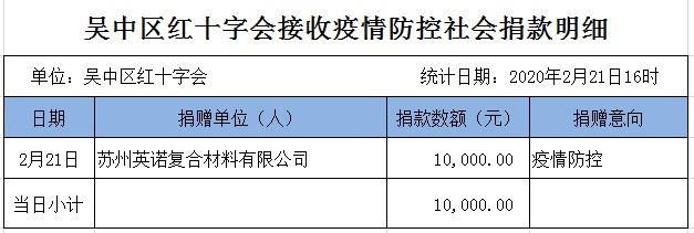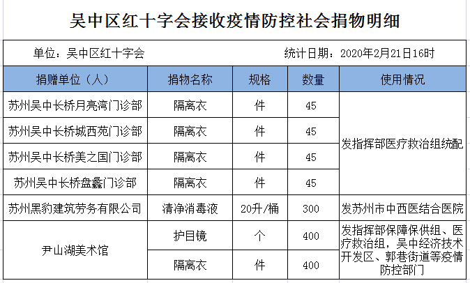 2月21日,吴中区红十字会收到疫情防控捐款10000元,当日接收物资3批次,已安排发放使用。