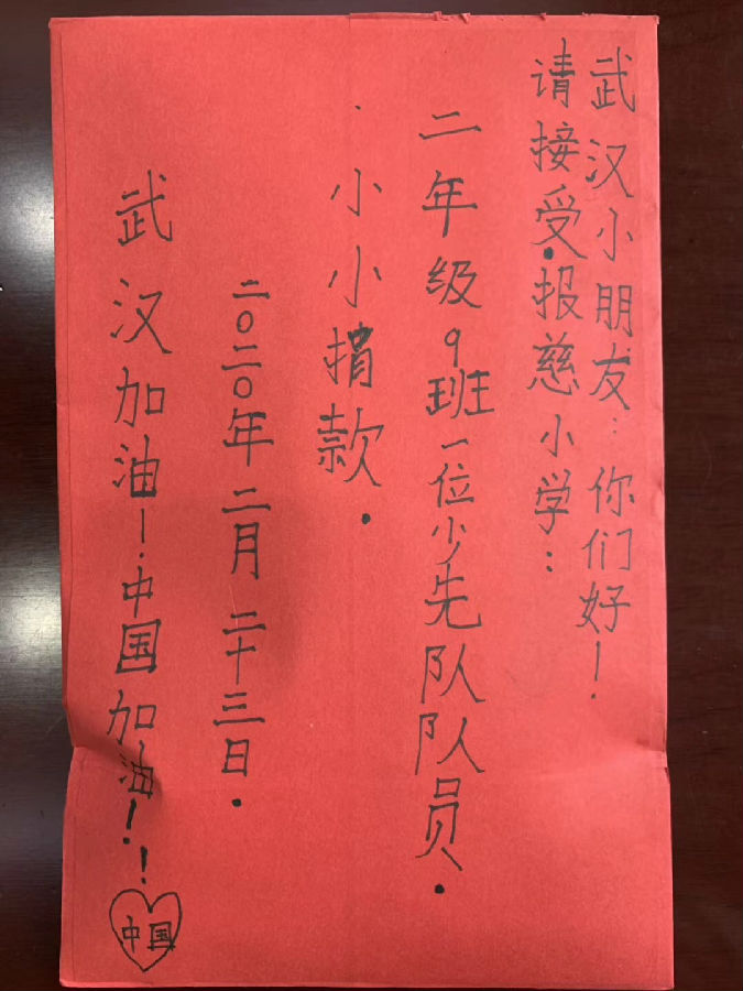 近日,一名家长联系了报慈小学的值班老师后,在门卫放下了自己孩子的一笔爱心捐款。这是该校收到的第一笔学生自发的捐款。