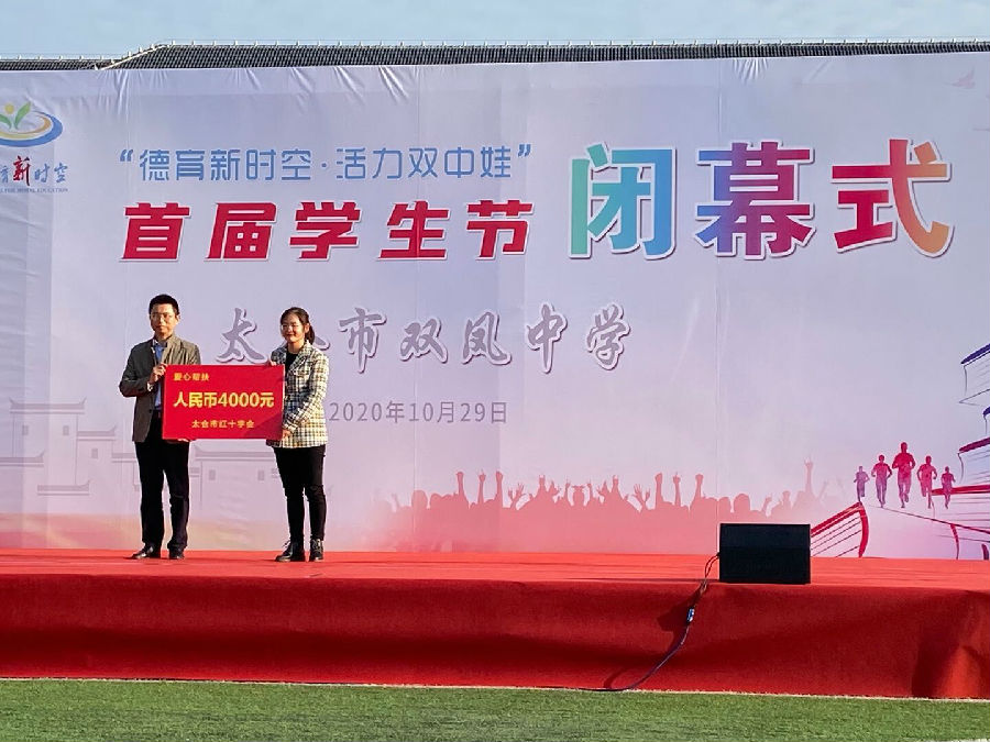 近日,“德育新时空.活力双中娃”双凤中学首届学生节闭幕式暨生命安全体验馆揭牌仪式在双凤中学举行,市红十字会、市教育局、双凤镇相关领导为教育馆揭牌。揭牌仪式上,市红十字会向双凤中学捐赠帮扶资金4000元,用于资助8名贫因生。