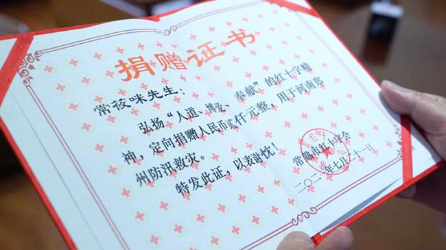 连日来,河南省多地遭特大暴雨袭击,降雨量突破历史极值,强度甚至是千年一遇。部分地区发生城市内涝、泥石流和山体滑坡等灾害,人民群众生命财产安全受到严重威胁,其中郑州市尤为严重。常筱咪先生从电视节目中看到灾区形势严峻,深为关切、夜不能寐,他决定立即捐款献爱心,帮助灾民度过难关,并留言道:郑州的百姓受苦了,希望把这点心意转送给灾区。