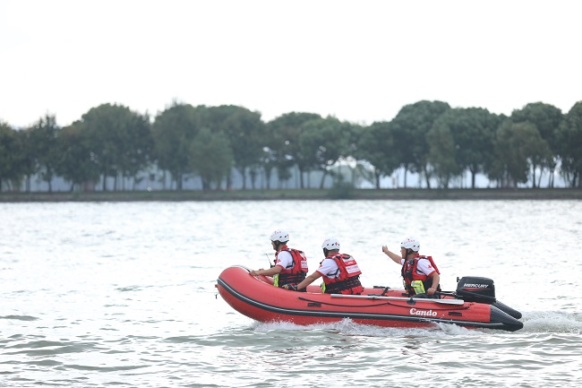 随后,常熟市红十字救援队在尚湖水面上开展水上救援应急演练,红十字心理援助志愿服务队协助做好心理援助,由常熟市政府副市长、市红十字会会长张月明任总指挥,红十字会常务副会长陈伟娟任副总指挥,红十字会赈济救护部部长何建明为现场指挥。演练模拟在尚湖水域突发一起游船事故,船只受损严重,有沉没危险,数名游客被困游船,且有游客落水受伤。本次演练的开展考验了红十字救援队对于水上突发事件应急救援流程的掌握程度,检验了应急救援各单位和各环节的衔接配合,进一步提升水域救援能力。