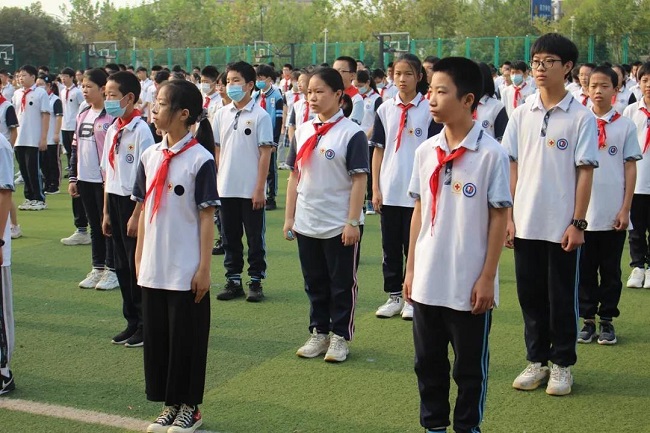 随后,由少先队大队辅导员刘文娟老师领誓,新会员面向会旗庄严宣誓。同学们立正站好,高举右拳,面向会旗,大声宣誓:“我志愿加入中国红十字会,自觉遵守《中国红十字会章程》。”洪亮的宣誓声响彻操场,声声誓言让同学们明确了红十字会员的责任和义务,坚定了做好志愿服务的决心和信心。