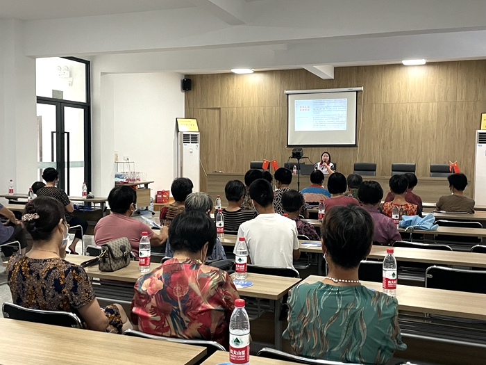 7月27日上午,吴江东风村老年活动室热闹非凡,老人齐聚一堂,一堂养老照护知识讲座正在举行。吴江区红十字会养老照护师倪菊芳现场授课。