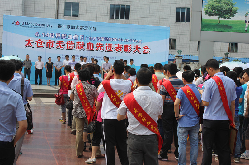 6月14日上午,市民广场上人头攒动,来自各镇红十字会、社区红十字服务站、健雄学校红十字会的百余名代表纷纷来到这里参加活动。原来今天是第九个世界献血者日,今年的主题是“每位献血者都是英雄”。为了崇尚日常生活中默默无闻的无偿献血志愿者,表彰那些用自己的鲜血挽救生命的无名英雄,积极鼓励更多的人自愿、定期参加无偿献血,由市精神文明办公室、市献血办公室、市卫生局主办,市红十字会、市血站承办的2010-2011年度无偿献血先进表彰大会在这里举行,市卫生局副局长陆炜主持活动。
