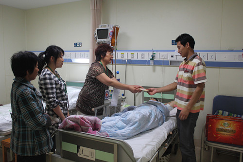 在得知这个情况后,我会及时与当地镇红十字会联系并与媒体联合,进行爱心募捐动员。6月11日下午,太仓红十字会顾秀英秘书长及工作人员前往人民医院ICU室看望马道燕。病床上的马道燕脸色苍白,鼻子里插着管子。因近十天的禁食,只能靠着营养液来维持,显得非常憔悴。顾秘书长站在病床边安慰马道燕,让她不要担心,要坚强,要战胜疾病,有好多好心人在关心着她,太仓就是她的第二故乡。我会还专门送去了营养品和慰问金,让外来民工感受到来自他乡的一份温暖和关怀。马道燕和她的丈夫感动得掉下了眼泪,连声说不知道怎样来感谢红十字会。