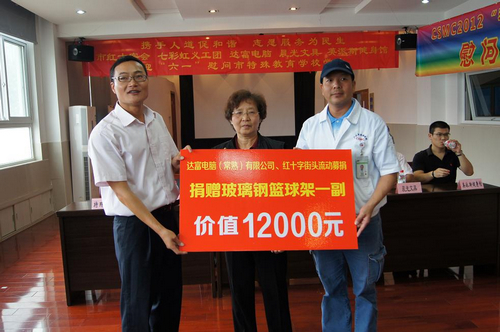为彰显红十字会“人道、博爱、奉献”的红十字精神,凝聚公益力量,推进和谐社会建设,常熟市红十字会在今年“五•八”博爱月期间,组织达富电脑、晨光文具、英派斯健身馆、七彩虹义工团的爱心人士参加此次公益活动,旨在为聋哑学生送上社会的关爱,让他们共享生活的阳光和温暖,快乐成长,并以此庆祝孩子们的节日。在现场,市红十字街头流动募捐、达富电脑赠送价值12000元的篮球架一副,英派斯健身馆赠送篮球、足球、跳绳等体育用具,晨辉文具赠送125份文具给全校学生。