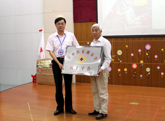 会议首先由黄萍秘书长宣读区红十字会《关于同意吴中区东湖小学成立红十字会的批复》,朱瑞良副会长授予学校红十字会会牌和会旗;全体参加仪式的师生面对红十字会会旗庄严宣誓;吕雯倩同学代表青少年会员发言;王辛校长代表学校红十字会感谢各级领导的关怀,此次红十字会的成立,得到了全校师生热烈的响应,相信一定会推动学校德育工作更上一个新台阶。朱瑞良会长代表区红会讲话,对东湖小学成立红十字会表示热烈祝贺,同时对学校红十字会工作寄予了希望,提出了要求。徐伟英副局长充分肯定了学校长期以来所做的工作,表示学校要大力开展红十字青少年工作,结合德育教育,开展丰富多彩的创新实践活动,让红十字精神深入人心,让青少年关爱他人、关爱社会。