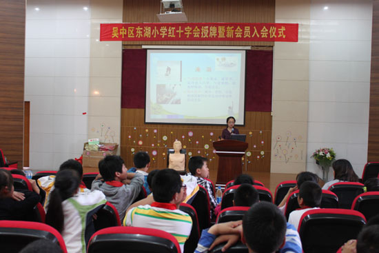 为弘扬“人道、博爱、奉献”的红十字精神,更好地开展学校红十字会工作,吴中区东湖小学5月11日下午,在学校阶梯教室举行了红十字会成立仪式。区教育局副局长徐伟英,区红十字会专职副会长朱瑞良,秘书长黄萍及学校领导出席了本次成立大会。