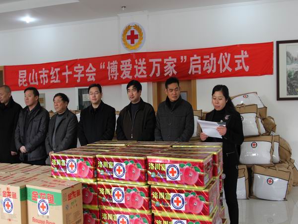 1月4日下午,昆山市红十字会在卫生局大楼正式启动“博爱送万家”慰问活动,昆山市红十字会常务副会长刘超英及各区镇红十字会秘书长共同参加了启动仪式。