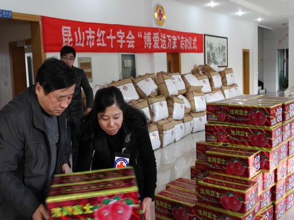 在启动仪式现场进行了物资发放。昆山市红十字会在节前就积极筹措送温暖款物,此次筹集的物资有食用油、大米、棉被、水果等价值10万余元,发放慰问金55000元。这些款物在春节前将由各乡镇红十字会组织广大红十字会会员和志愿者采取多种形式入户慰问,为各级各类的生活困难家庭送祝福、送关爱、送温暖,从而在人道救助方面替政府分忧、为部分困难群众解难、促进社会和谐稳定。