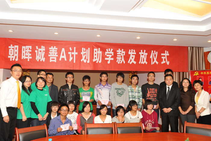朝晖诚善A计划今年对苏州大学、苏州科技学院、东南大学苏州研究院、中科软件学院等学校的120名贫困学生进行资助,发放助学款共计30万元。