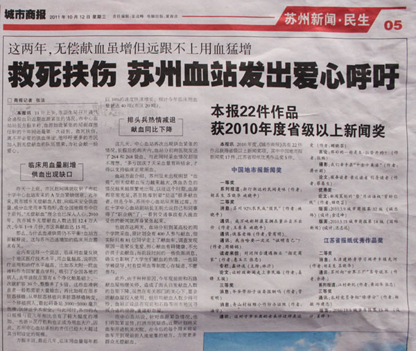 10月12日,《城市商报》第5版“民生”栏目刊登了“救死扶伤 苏州血站发出爱心呼吁”,报道了这两年无偿献血量增加,但远远跟不上临床用血猛增的实事,血站呼吁更多的市民加入到无偿献血的队伍里来,为需要救助的人献一份爱心。