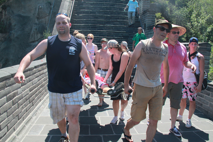 夏令营活动中让营员们感受最深的是在登长城活动中,恰巧遇到一位来自荷兰的游客脚扭伤,无法行走,我们的营员们发挥了红十字人道救助的专长,抬起担架,历经2个多小时将荷兰游客抬下了长城,送到急救点,挥汗如雨的红十字志愿者让游客们深感敬佩!