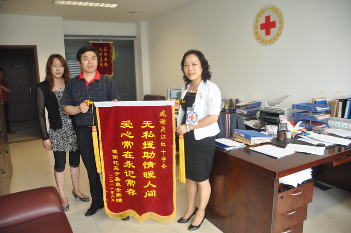 6月21日下午,白血病男孩于嘉良的亲属来到吴江市红十字会办公室,将一面写有“无私援助情暖人间,爱心常在永记常存”的锦旗送给吴江市红十字会。于嘉良是一名初二学生,身患白血病,需骨髓移植,父亲病残,爷爷重病,巨额的医疗费用让一家人陷入了困境,一家三代的不幸遭遇引起了社会的关注。吴江市红十字会在得知情况后,第一时间前往于嘉良家里看望了他,并送上了5000元“大病救助金”,同时启动救援程序,向社会发出呼吁,全力为于嘉良筹集善款。吴江红十字会与报社、爱心网站联合宣传发动,接受广大市民和网友的热心捐款,同时,配合爱心群众自发的义演、义拍、义卖等募捐活动,共为于嘉良募集善款48963.8元。目前,在社会各界爱心人士的帮助下,于嘉良已顺利完成骨髓移植,身体正在恢复中,于嘉良的家人对吴江市红十字会所做的大量工作及社会各界爱心人士表示深深的感谢。