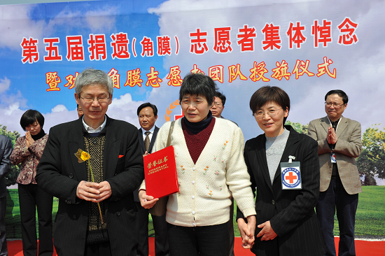 活动仪式上市政府副秘书长、市红十字会副会长张曙向劝捐角膜志愿者团队授旗;市卫生局局长、红十字会副会长张月林,市教育工会主席、红十字会副会长沈宇为“劝捐角膜志愿者培训基地”揭牌;市红十字会常务副会长严晓凤向成功捐献角膜志愿者家属颁发了《荣誉证书》。
