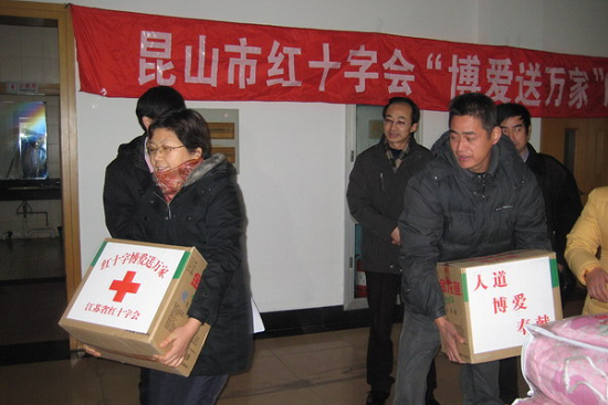 在启动仪式现场进行了物资分配。昆山市红十字会在节前就积极筹措送温暖款物,至春节前将由各乡镇红十字会组织广大红十字会会员和志愿者采取多种形式入户慰问,为各级各类的生活困难家庭送祝福、送关爱、送温暖,从而在人道救助方面替政府分忧、为部分困难群众解难、促进社会和谐稳定。此前,市红十字会联合玉山镇红十字会对玉山镇的三户困难群众进行了慰问,给他们带去了红十字会的温暖。