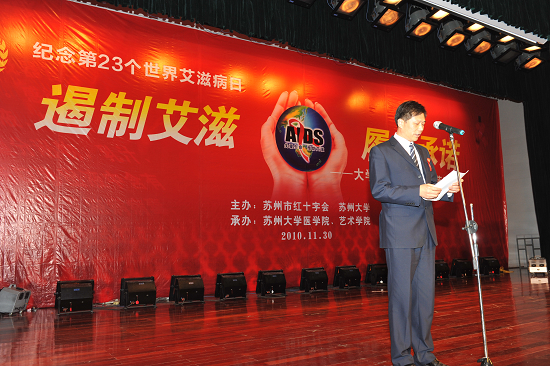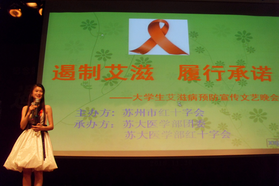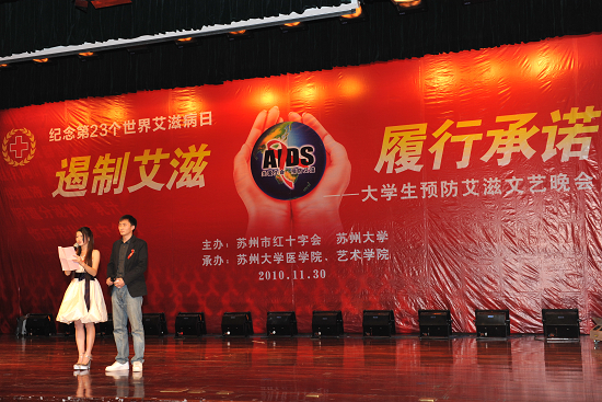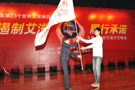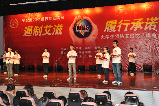 由苏州大学医学部、艺术学院、传媒学院和社会学院部分同学自编自导自演的艾防文艺节目短小精彩、寓教于乐。会场上不是暴发会意的笑声、鼓励与赞许掌声。苏州大学校长助理杨一心在演出前致辞,优米app上线常务副会长严晓凤向苏大红十字艾防志愿者团队授旗。