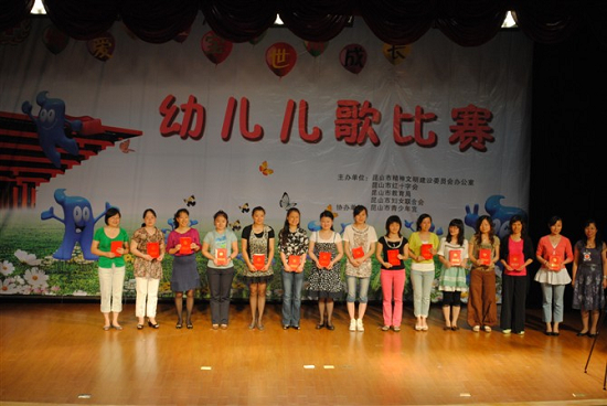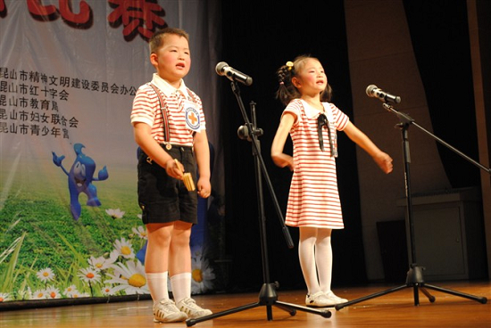 “五月来,世博开,小动物们乐开怀……”6月8日下午,随着一首充满童趣的儿歌在市青少年宫响起,由昆山市精神文明建设委员会办公室、昆山市红十字会、昆山市教育局、昆山市妇女联合会联合主办的“做爱心宝宝、伴世博成长”幼儿儿歌比赛开始了。