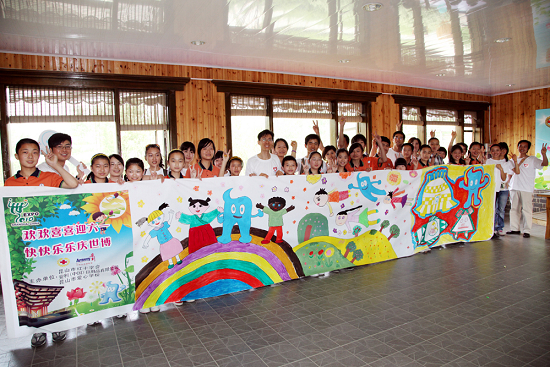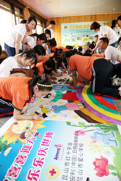 作为上海世博会志愿者专业合作单位,安利公司将在7月中在上海举办世博青少年体验营,全国将有100个青少年到本次体验营中观看世博、体验志愿者活动,昆山爱心学校得到了世博体验营的两个名额。届时,爱心学校的李培艺和李灵娇小朋友将去到上海,参加世博青少年体验营的活动。尽管孩子们不能全部去现场参观,但也专门合力为世博作了一副长卷画,向世博会献礼。