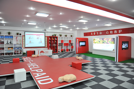 揭牌仪式结束后,领导们来到“少儿红十字救护普及园”现场参观。占地200多平方米的空间里,摆放了小安妮模型、担架、轮椅和急救箱、娃娃等物品。这里可以容纳30—50位小朋友同时进行止血、包扎、固定、搬运的操作体验;三面墙上均有大电子显示屏,可以模拟灾害现场情景,让小朋友们从心理上不畏惧灾难;沧浪少年宫的老师们经过市红十字会的相关培训,已经可以辅导小朋友在灾难来临时如何应对自如,如何逃生和自救互助。