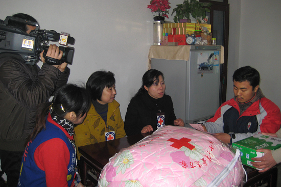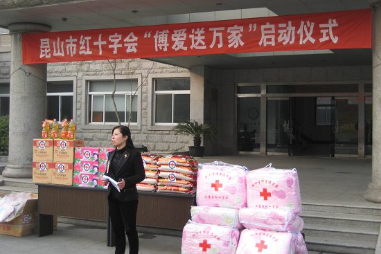 1月28日,昆山市红十字会开展的“博爱送万家”活动来到朝阳新村,慰问贫困群众。2010年昆山“红十字博爱送万家”活动正式启动。