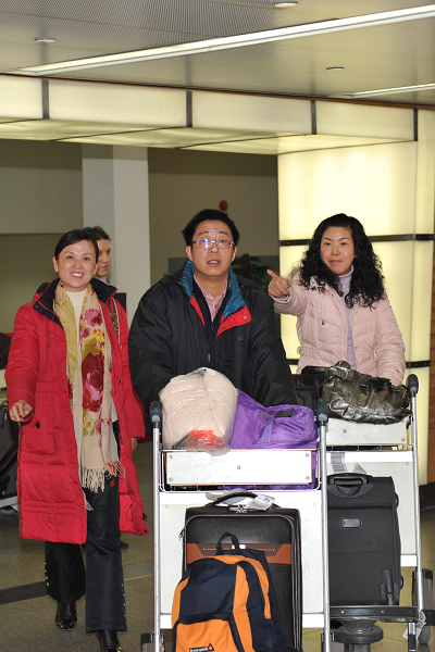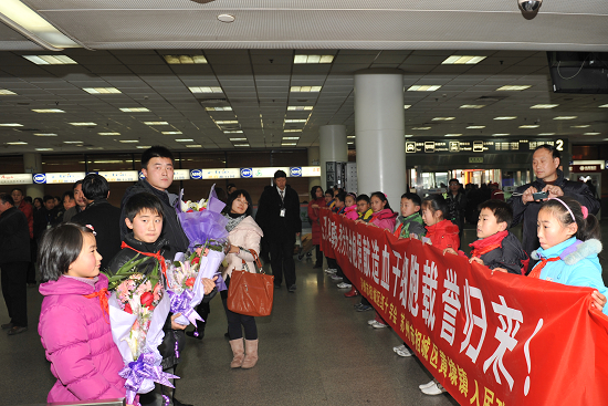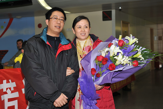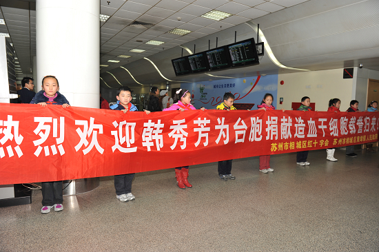 1月15日下午,在上海虹桥机场旅客出口处热闹非凡,十几位小学生举着“热烈欢迎韩秀芳为台胞捐献造血干细胞载誉归来”的横幅排成一排,韩秀芳所在单位和相城区及黄埭镇的领导也站在一边,迎接韩秀芳与丈夫及杭彬一行从北京归来。