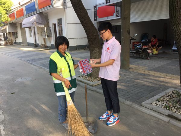 干净的城市环境离不开环卫工人的辛苦工作,他们是城市的“清洁工”。红十字志愿者在同里开展活动时和一位环卫阿姨交谈很久,“这份工作虽然简单但也非常累,每天都要起早,如果遇到马路上的垃圾很多就要一直扫到中午,有的时候午饭都来不及吃”。但当志愿者们试图帮助阿姨扫地的时候却被阿姨拒绝了,“这是我的责任”。
