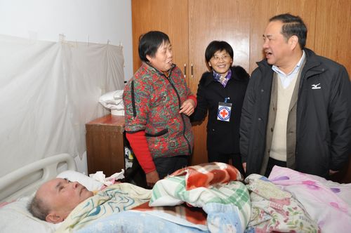 仪式结束后,王市长上门慰问,为两户贫困家庭送上救助金,并向他们表示春节祝福。低保边缘家庭徐先生于2008年突发事故,导致壹级重度残疾,躺在床上生活无法自理,随时需要人照顾。妻子身体也不怎么好,两人征地保养金1360元,勉强维持生活。拿到救助金后,徐先生老伴连声说感谢,谢谢社会的关心帮助。