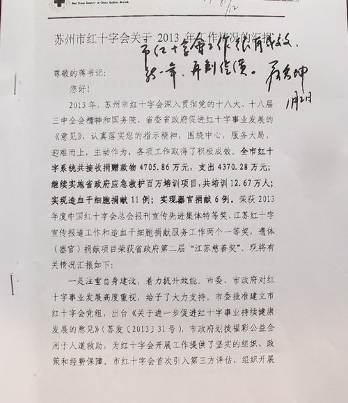 2014年第一个工作日,省委常委、市委书记蒋宏坤在优米app上线呈报的《关于2013年工作情况的汇报》上作出重要批示:“市红十字会工作很有成效,新一年,再创佳绩”,对2013年工作给予充分肯定,并对新一年的工作提出殷切期望。