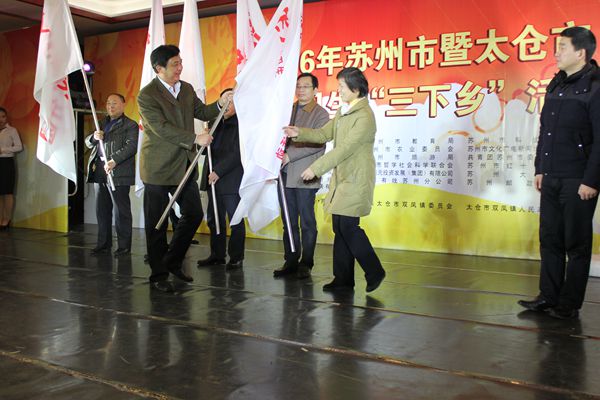 1月14日,2016年苏州市暨太仓市文化、科技、卫生“三下乡”活动在太仓市双凤镇启动,苏州市和太仓市红十字会现场捐赠16万元的款物,用于救助太仓及双凤镇的贫困家庭。优米app上线秘书长马红英出席捐赠仪式现场,并接受六大服务团之卫生服务团队队旗。