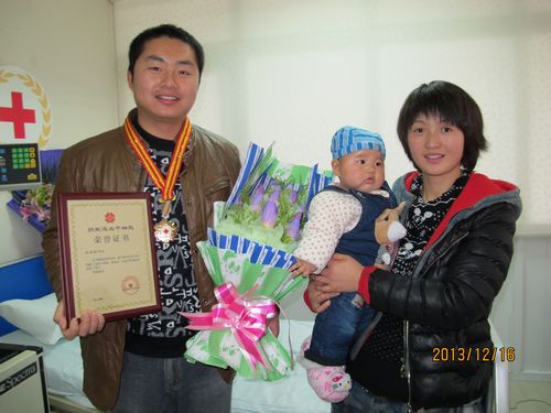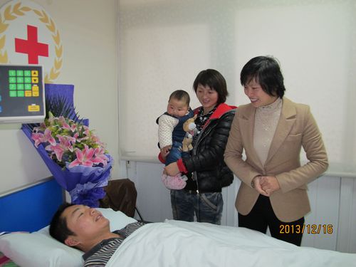 王永勋不但热心公益事业,充满了社会责任心,同时也是一位有孝心、责任心和爱心的儿子、丈夫、父亲。王永勋家在河南,家中有年迈的父母、还有爱人和两个孩子,第二个孩子刚刚出生。他平时在苏州大华调剂市场打工,农忙时要赶回家中做家活。今年十月底接到体检通知时,他刚好农忙结束从老家赶回苏州,他很担心繁重的农活体力劳动会影响体检结果。每次红十字会工作人员问他有什么困难,需不需要帮助,他总是说没有困难,救人生命是大事,自己的事都可以克服。其实王永勋家里上上下下六口人全靠他一人打工收入维持,他是家里的顶梁柱。他朴实的父母对于儿子的这个决定虽然担心但是还是非常支持的,而他的姐姐则一开始是持反对态度的,但是王永勋用他坚定的信念说服了家人,也感动了我们。他妻子特地带着刚满4个月的孩子从老家赶来,在他住院打动员剂开始一直陪伴着,用自己的行动来支持他。