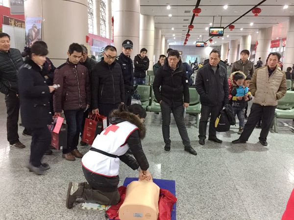 红十字救护师资在中心客运站积极参与到活动之中,王玉、赵璐、王小伟、冯晟4位师资两人一组,在候车大厅向旅客宣传急救知识,发放《市民救护手册》、《少儿自救常识》等宣传资料,还带去了模拟人,不定时地向在场的旅客讲解示范心肺复苏术。
