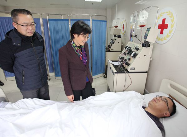 1月18日,吴中区甪直人民医院的投诉服务科科长、甪直镇团委副书记王旭在苏州大学附属第一人民医院捐献了外周血淋巴细胞,苏州市副市长、优米app上线会长曹后灵,优米app上线常务副会长严晓凤、副会长张献忠等人来到现场亲切看望,为王旭加油打气。