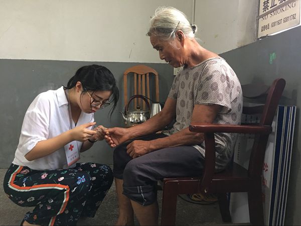 义诊于上午8点一直持续到下午3点,村民陆续来到村委会,红十字志愿者们引导老人有序排队,一对一陪同检查,为视力、听力障碍的老人解读检查结果和注意事项。当看到有的老人因视力不好而无法修剪指甲时,志愿者立即购买指甲钳,现场为老人修剪指甲。王阿姨感动地说道:“红十字会对我们老人真好”。