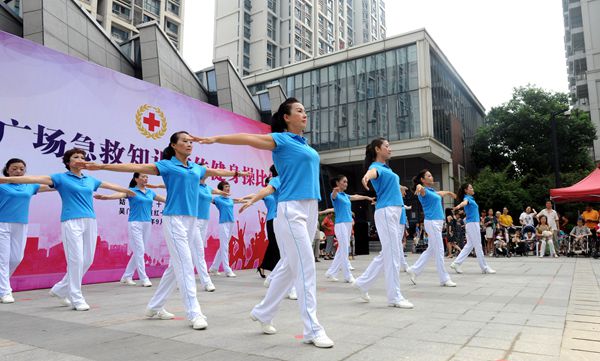 本次活动中展示的健身操分别是《白金十分钟》和《海姆立克的拥抱》,其中《白金十分钟》主要表现的是事故发生后的最初几分钟进行心肺复苏的重要性,《海姆立克的拥抱》则主要介绍了急性呼吸道异物堵塞该如何进行急救。两套健身操在几分钟的时间内,就能让人快速了解两种急救技能的操作要点,吸引了不少居民群众驻足观看。