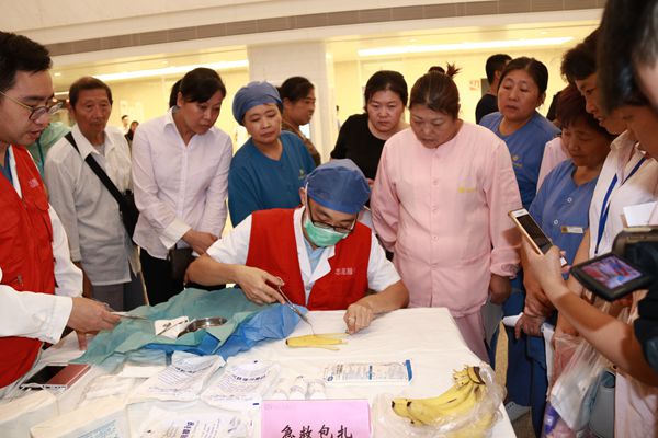 后勤党支部招集医院近50名后勤人员参加学习,让医院保安、保洁、导医们一起参加培训,掌握急救要领;外科支部的党员医生们撩起“神秘的面纱”,手把手教导市民和医院后勤人员急救缝合、包扎伤口的技巧;门急诊党支部的医护人员们为市民和后勤人员进行心肺复苏术教学。