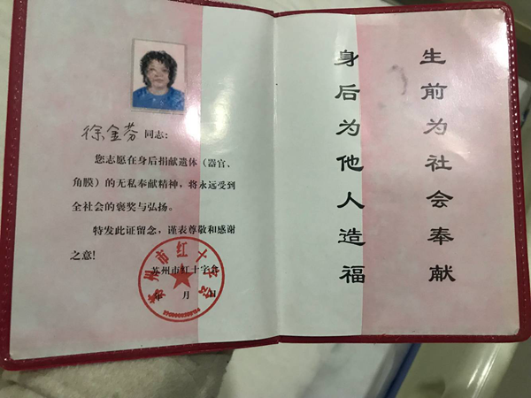 当日下午17点半,54岁的张家港市金港镇居民徐金芬因病不幸离世。遵照她的生前遗愿,她的眼角膜将捐献给他人延续光明。