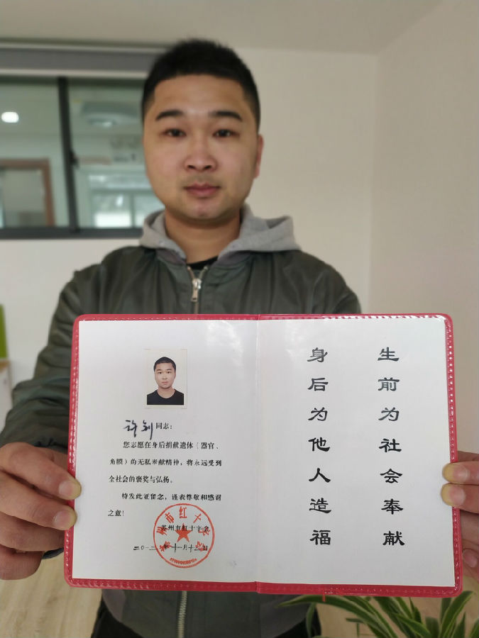 “他从小就很有正义感,喜欢帮助别人”,许钊母亲说,儿子的举动并没有让她觉得意外,一开始有些接受不了,但是在儿子的劝说下,她被感动了,所以和儿子一起去办了登记手续,真心希望自己能帮助到他人。