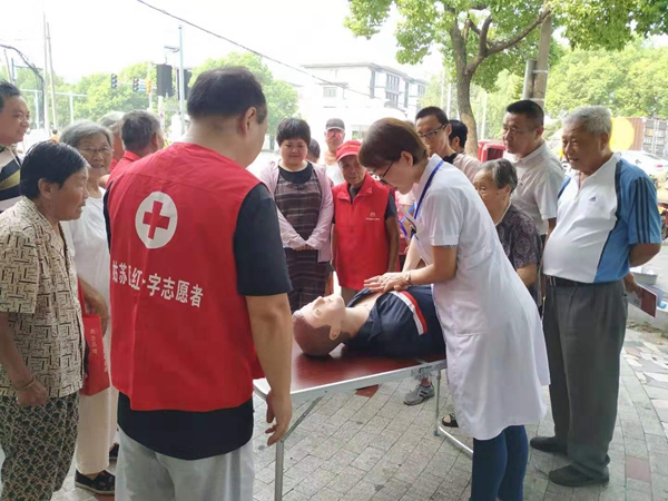 红十字应急救护培训师李俊绣带领志愿团队,分组按序在社区小广场、辖区单位,向大家介绍并演示了心肺复苏的操作流程和注意事项;假设在事故发生后,验伤的程序及注意要点,规避因处理不当而造成伤害……随后,利用模拟人,手把手指导居民进行“心肺复苏”操作,不断激发大家的学习热情,形成了良好的互动交流。现场,志愿者们伴随节奏欢快的舞曲,把急救知识宣传融入《急救白金十分钟》广场舞中;还为居民们免费测量血压、血糖,并就测试结果,给予被测居民中肯的就诊建议和科学的生活起居、饮食指导。