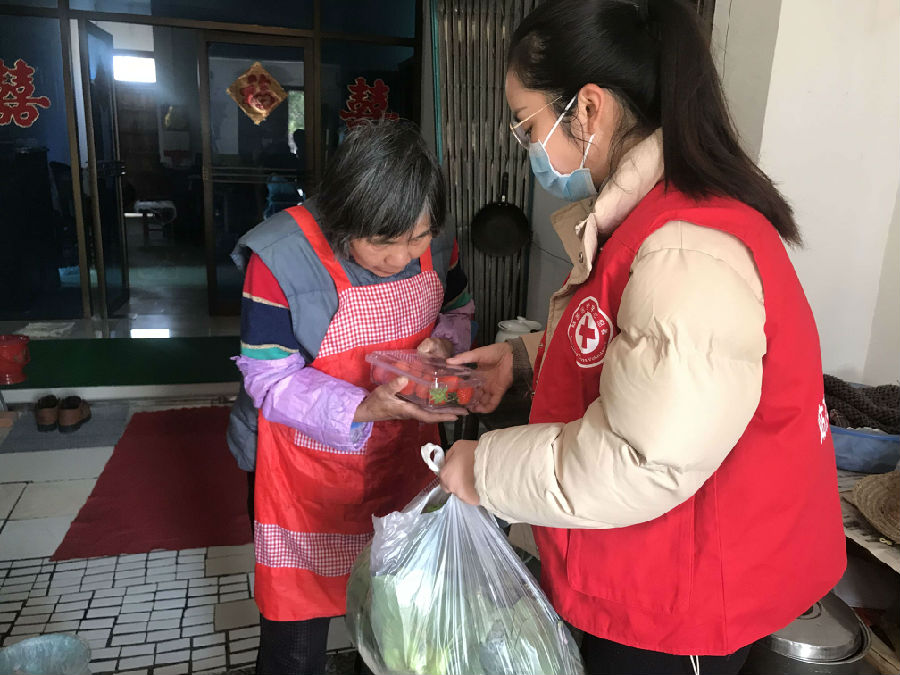 “金阿婆,这两天吃的菜我们都替你买好了,你这几天就不要出了”,清塘社区工作人员和红十字志愿者一起提着菜,来到孤寡老人金秀清的家中。考虑到目前疫情形势严峻,几位志愿者特地买来青菜、豆制品和鸡蛋等送上门,让老人不用出门就能吃到新鲜菜。(谢涵)