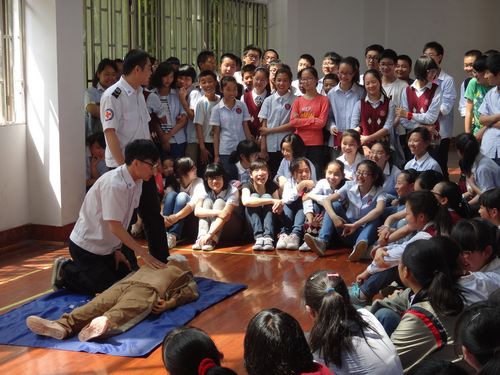9:30,健雄职业技术学院的课间操上,两位老师给全校师生带来了一堂心肺复苏课。随后,二中的体育课上,5个班级的学生们纷纷饶有兴致的围在急救站工作人员身旁,听心肺复苏讲解,并在模拟人身上体会了一把。当我们发生意外伤害时,心脏呼吸骤停,掌握必要的急救知识能挽救他人的生命。