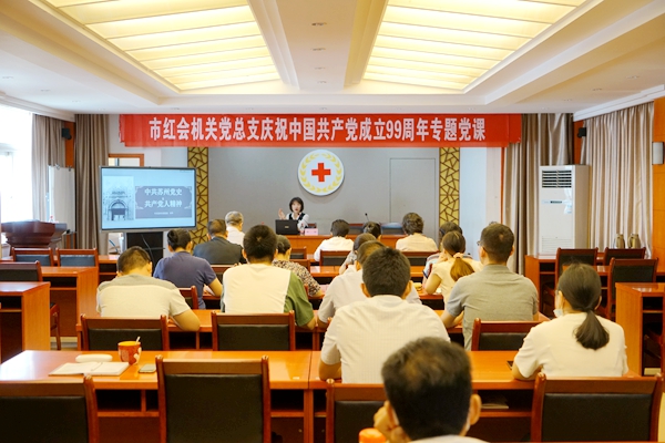 为庆祝中国共产党成立99周年,市红十字会于7月1日举办专题党课,全体党员和入党积极分子参加。