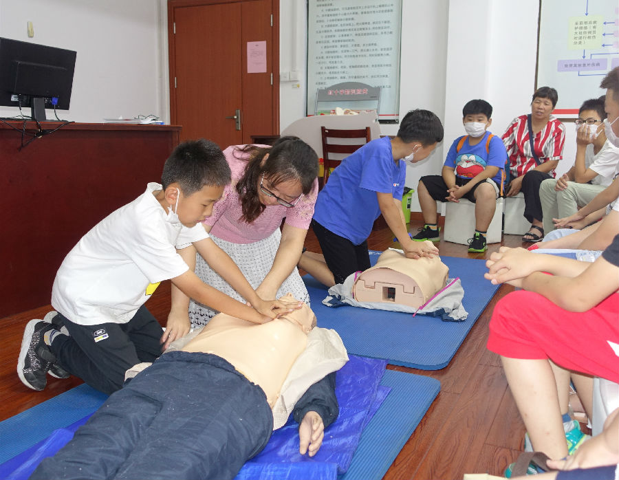 操作环节,小小急救员纷纷上前勇敢尝试,每个人都认真地在老师的指导下进行练习,手法虽然不是很专业,但也做得有模有样。