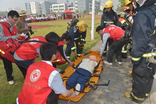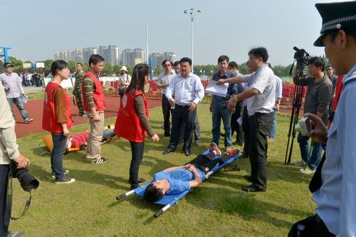 市红十字会应派出了17名急救援志愿者在现场对伤员进行了第一时间的急救,演示了止血包扎、骨折固定及心肺复苏术,队员反应迅速、分工明确、配合紧密、处置得当,得到了现场观众的赞许。