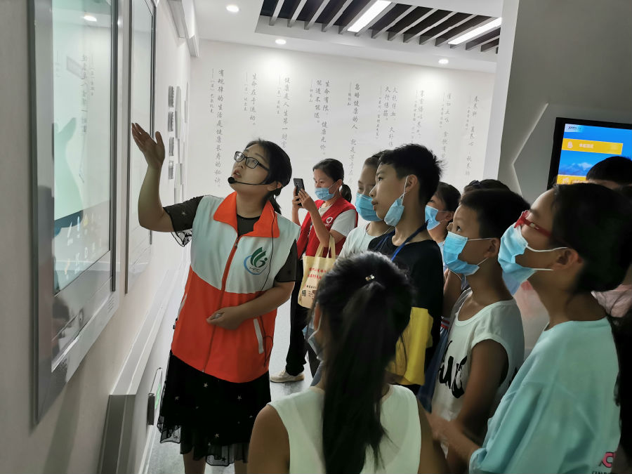 随后,小营员们来到了张家港市新时代文明实践卫生健康分中心的健康科普馆,兴致勃勃地参观和体验了这个充满趣味的文明实践新阵地。在讲解员的带领下,小营员们对场馆内的合理膳食、适量运动、戒烟限酒、心理平衡以及生命周期五大区域进行了互动式体验,学习了许多实用的健康科普知识。