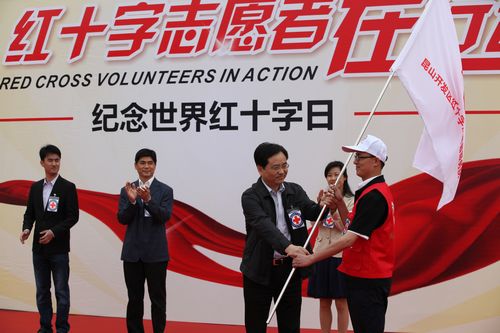 现场举行了开发区红十字志愿服务队及昆山市级机关红十字工作委员会成立仪式,市委宣传部副部长、市红十字会副会长金健鸿,市卫生局局长、市红十字会常务副会长陈青林分别授旗和授牌。